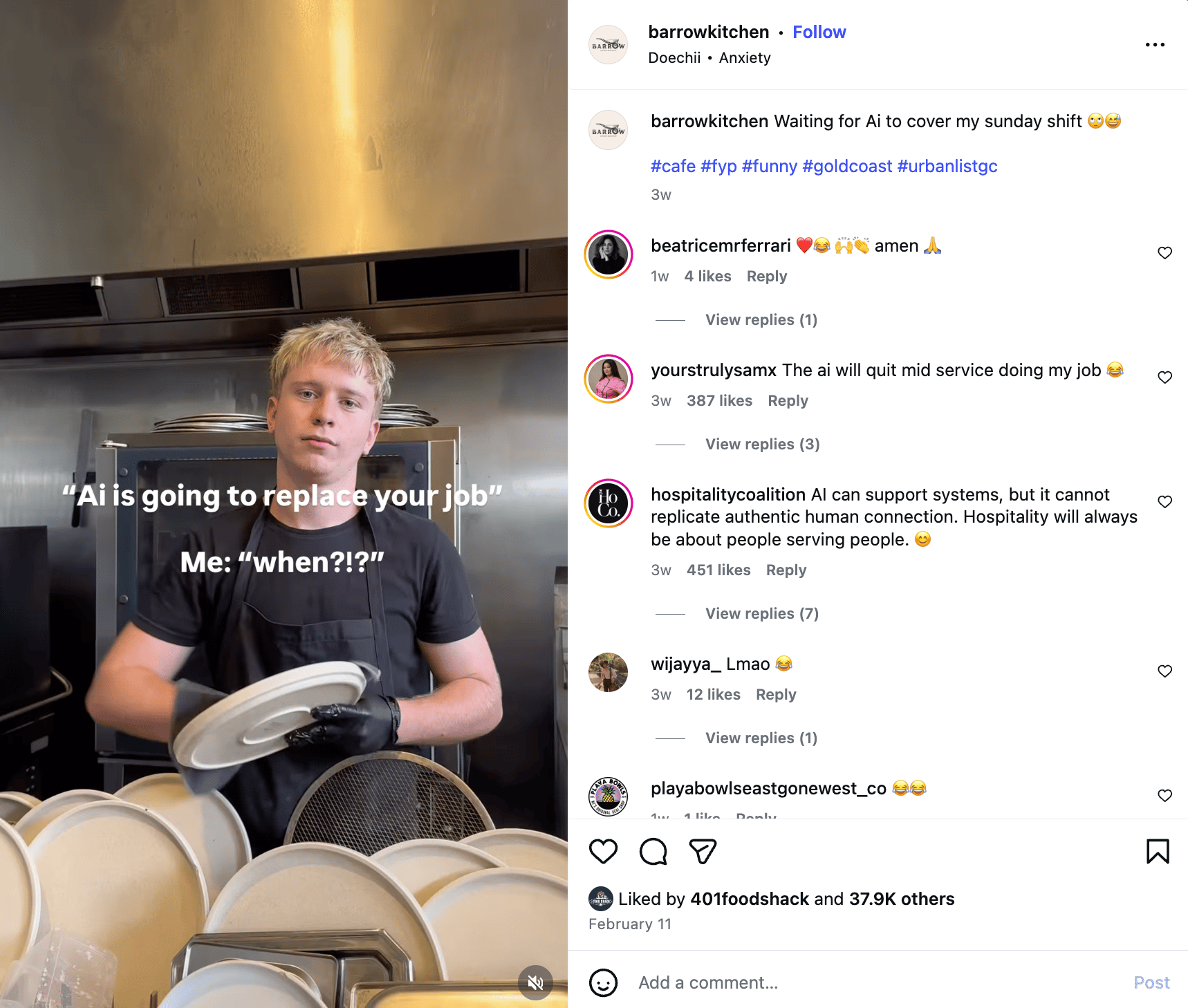Why it works: Humor stops the scroll. This trend taps into a big cultural conversation while showing the human side of your business—and reminding followers that some jobs still require real people, real skill, and a little personality.
