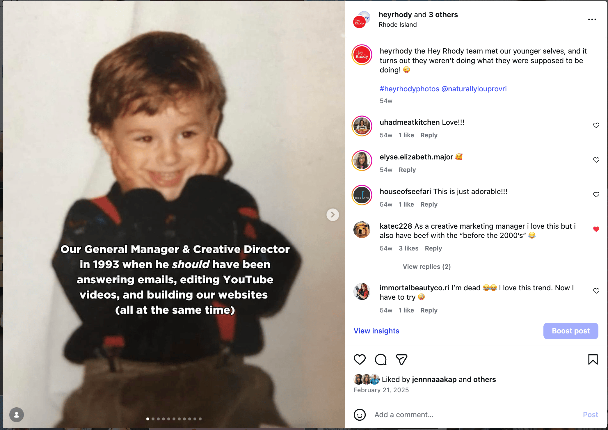 Why it works: Nostalgia stops the scroll. It humanizes your business, sparks conversation, and reminds followers there are real people behind the brand—who were once very small humans.