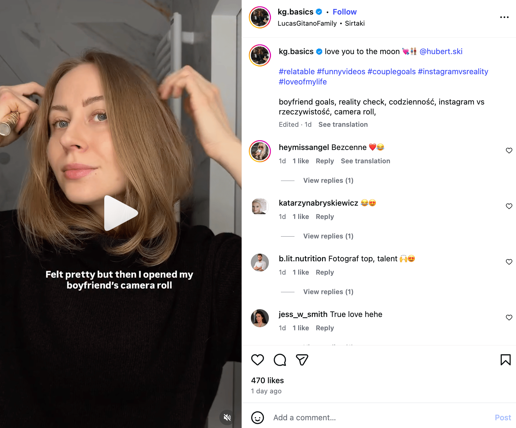 How to use it: Film a quick selfie-style Reel “manifesting” the perfect Valentine, then let the description clearly mirror you. Keep it short, playful, and tongue-in-cheek. Text overlays do the heavy lifting here – no fancy edits required.
