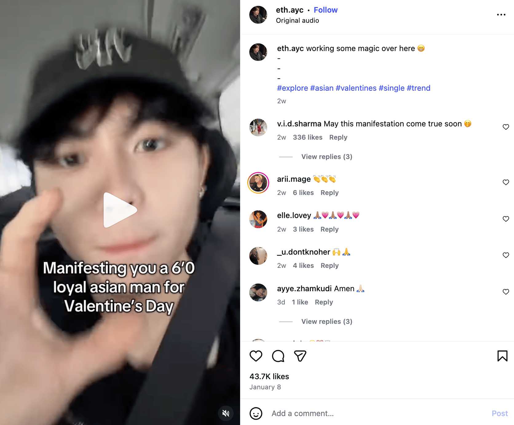 The trend: This Valentine’s-adjacent Reel flips manifestation culture on its head. Creators and brands “manifest” their ideal Valentine—the vibe, the traits, the energy—but the twist? They’re actually talking about themselves (or their brand personality). It’s flirty, self-aware, and just delusional enough to work.